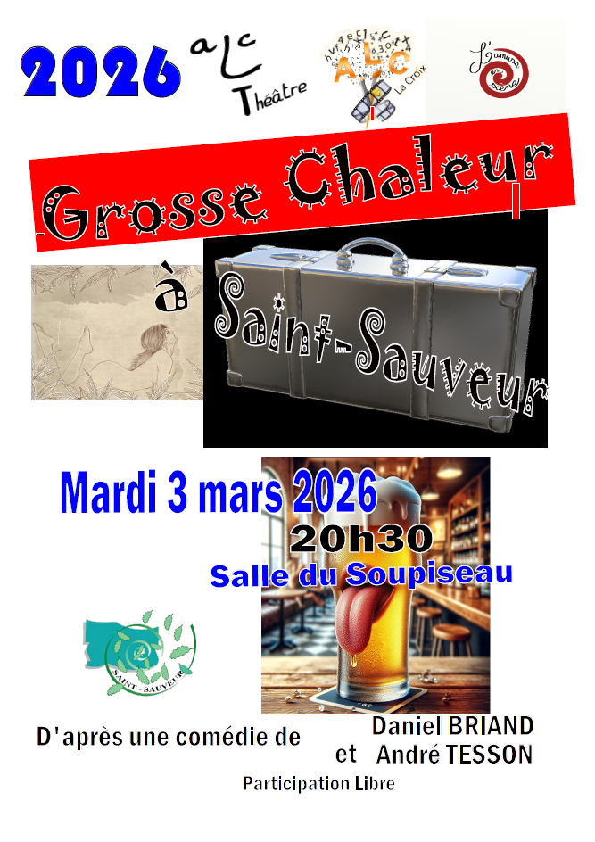 Le mardi 03 mars à 20h30, à la salle des fêtes de Saint-Sauveur, chemin du Soupiseau, la troupe de théâtre de Lacroix Saint Ouen, L'AMUSE EN SCÈNE, vous présentera sa toute nouvelle pièce intitulée "GROSSE CHALEUR" !